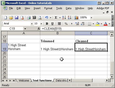 =VALUE(C13) We can now copy this down our list and use Sum again to total our new column: As you can see, the text values are now treated as numbers and Sum works correctly. These two functions can be used to remove unwanted characters from text. Sometimes, if you import text from other sources, you may end up with non-printing characters, such as carriage returns - Clean will remove these. Trim can be used to get rid of extraneous spaces: In the following example we have part of an address that includes multiple spaces between 'High' and 'Street' and a carriage return character to separate the lines of the address. In column B we have used Trim to get rid of the extra spaces: =TRIM(A19) and then in column C we have used Clean on the result to remove the carriage return: =CLEAN(B19) Note that the Trim function leaves a single space between High and Street, but that the Clean function removes the carriage return entirely. |