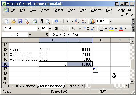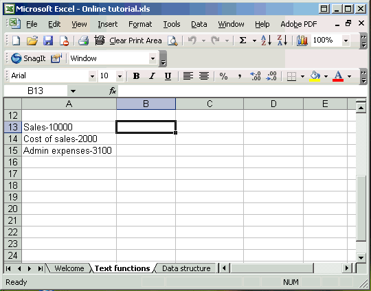 Use with care Do make sure that any tips and suggestions work as you expect them to in your own particular circumstances. Excel's Indirect function allows the creation of a formula by referring to the contents of a cell, rather than the cell reference itself. Of all the functions covered in our Excel courses, it is often Indirect() that attendees haven't come across but find an immediate use for, often saving a great deal of time and effort in the process. If you have several sheets, each with information for a single department for example, you may want to set up a summary sheet. Rather than creating separate formulae to refer to each sheet, Indirect() can allow you to create a single set of formulae all of which use a reference to a sheet name held in a cell - hopefully an example will make this clearer. To refer to cell A2 on a sheet named 'Cuddly Toys' we would use a formula like this: ='Cuddly toys'!A2 However, sometimes it would be useful to be able to change a whole series of references to, for example, a different sheet. We could type the sheet name into a cell on our main sheet, say A1. We could then write a formula to refer to cell A2 on the sheet typed into cell A1. If we simply type: =A1!A2 Excel, not unreasonably, looks for a sheet named A1 and fails to find it. However, we can use the Indirect function instead. Here is the screen from the Paste Function dialog for Indirect: "'" & $A$1 & "'!A2"Our Ref_text entry is a little confusing, so we have highlighted the pairs of speech marks in different colours. We have two items of text, and sandwiched in between them, an absolute reference to the contents of cell A1 - as you can see this correctly returns the contents of that cell - Cuddly toys. The ampersands are used to join the 3 elements of our Ref_Text together. The first text section simply holds a single apostrophe - this is necessary because, if our sheet name contains a space, it must be surrounded by apostrophes to be correctly identified. The second section contains an absolute reference to cell A1 - the cell where we type the name of our sheet. The third text section contains the closing apostrophe for the sheet name, together with the exclamation mark that separates sheet name from cell reference, and the cell reference itself - A2. This works well to return the contents of cell A2 on our cuddly toys sheet, and if we were to type in 'Boardgames' for example, it would automatically return the contents of cell A2 on a sheet named 'Boardgames'. However we do have a problem left to solve. We need to refer to many cells on the price list sheets, but if we copy our Indirect cell, the reference to A2 doesn't change, because it is just text. We can solve this by using a row/column style reference instead of A2: "'" & $A$1 & "'!RC"Note that we have to set the 'A1' argument of the function to 'False' to use this reference. RC will return the current row and column - so a formula in cell A2 will refer to A2 on cuddly toys, A3 to A3 and so on. If we need to refer to a different cell we would add numbers in square brackets after R and C. So R[1]C[1] would look at the cell one row down and one column right for example. Get lots more Microsoft Office hints and tips Using Excel text functions to work with analysis codes - part 1This is the first part of a two part article that was prompted by a comparatively simple query about concatenating text. As well as dealing with that query, we'll look at some of the simpler Excel text functions for working with text. Part 2 will follow shortly and, in it, I'll look at some slightly more advanced functions for dealing with less predictable text entries. First of all let's deal with the actual query, which asked how to combine text in two separate cells into a single cell. There are two principal ways to achieve this. Perhaps the simplest is to use the '&' within an Excel formula: In our example we have typed three items of text in columns A, B and C. In cell D1 we have entered the following formula to combine all three into a single cell: =A1 & " " & B1 & " " & C1 Alternatively, there is an Excel function that concatenates text in this way. Unsurprisingly it is the 'Concatenate' function. In the following screen shot we have used 'Insert, Function' to enter the required details. Note that in order to include spaces between the items of text, we have included “ “ between each pair of cells. Using the Insert Function screen, you just need to enter a space in the appropriate text box - Excel will add the speech marks for you: So far so good, now let's see how we cope with combining numbers and text. If we just want the number without worrying about the number format, then we can use exactly the same formula as for two items of text. Here we have included some 'literal' text in the formula together with a number in a cell: As you can see the format is not ideal: In the following example we have used the 'Text' function to format the number in the cell: Note that you can also use named ranges. So if we name cell B3 as 'profit' we could write the formula as: ="Profit is " & TEXT(profit,"£#,##0") Note that we have included a space after the 'is' and before the “ so that the number does not follow on immediately from the text. To see the text functions available in Excel, select Insert, Function and then choose the 'Text' category (note that the examples shown are from Excel 2003, other versions' screens are slightly different): As you can see there are lots of text functions, we will look at a few in detail, but if you want to explore all of them, just scroll through the list using the down arrow key. As you select each function in turn you will see a brief description of what it does towards the bottom of the screen. For more details, click on the 'Help on this function' link: This group of functions can be used to return specific sets of characters from a text string. As you would imagine, Left is used to return a certain number of character