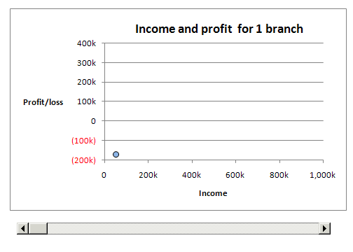 If we now click outside of our control and then click the scroll bar 'decrease' arrow we should see the number of branches reduce. We can now set up our chart using the Chart wizard in Excel 2003 and before, or the Insert, Chart ribbon group in Excel 2007. We've used a bubble chart in our example and formatted both horizontal and vertical scales to fix the maximum and minimum values so that they don't keep changing as we generate different sets of results. If we based our chart solely on the labels and values in A8 to B10, then the size of our bubble wouldn't change as it's based on the relationship between the biggest bubble and an automatic default, and we only have one bubble. To allow the bubble to increase in proportion to the number of branches, we've added some additional values to be included in our chart source data: