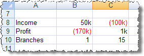The branches figure in column C is designed to be set to the maximum possible number of branches. This bubble will always be displayed, and so the 'real' bubble will be a proportion of its size. We don't want to see the maximum bubble so, since we've fixed the scales, we just set the income figure to a number that won't be shown on our chart. The Profit figure just needs to be not zero. This technique of adding additional series of data to achieve certain chart effects was covered by Andy Pope at the Excel User conference, and his website includes dozens of brilliant ideas for adapting Excel charts: http://www.andypope.info/charts.htm Finally we have set the chart title to automatically adjust to the number of branches selected. This is done by clicking in the existing text title and then clicking on a cell containing a formula that produces the required text: ="Income and profit for " & B10 & " branch" & IF(B10>1,"es","") Note the use of the IF() function to add the 'es' on to the end if there is more than one branch. |