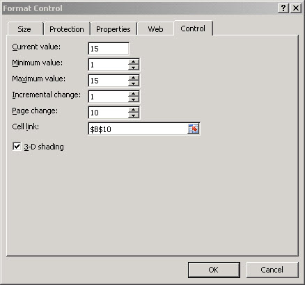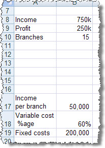 The variable we will be changing is held in B10 - the number of branches we intend to open for our organisation. To include our interactive slider we choose View, Toolbars, Forms to display the forms toolbar (Excel 2007: Developer ribbon, Controls group, Insert, Form Controls) , then click on the scroll bar tool and drag a horizontal rectangle under the area where our chart will be created. Then right-click on the scroll bar control and choose 'Format Control'. Here we can set our maximum and minimum values, the incremental change and, very importantly, the 'Cell link' which in our case is our branches cell: B10: