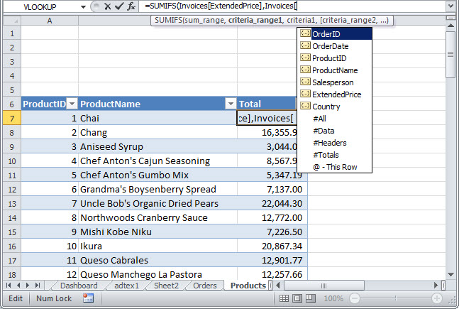 Automate Excel with tablesIntroductionWe've covered the new Excel Table feature already in lunchtime learning: Lists and tables: Excel's most underrated feature? Lists and tables 2: data entry This time, we are going to look at using two linked tables to create a set of summary data that could be used as an intermediate step in a management reporting workbook. If you are very comfortable with the use of PivotTables, then you might find that you can obtain a similar result more directly using a PivotTable, but the use of 'normal' Excel tables can be more predictable than the use of a more dynamic PivotTable and the structured language Table references are easier to work with than the GETPIVOTDATA() function. Equally, if you are happy working with relational databases, then it might be best to do the work in a database and just use Excel to link to the final result. Assuming that we are going to go the Tables route, we are going to create two external data ranges on two separate sheets. In Excel 2007/10 external data ranges are automatically created as tables. Our first range will link to a table of Orders in the Microsoft Northwind database: and our second range to a list of products: In both cases we have used the following option to enable us to select the fields we need in each external data range: Data ribbon, Get External Data group, Form Other Sources, From Microsoft Query. We have then navigated to the Northwind sample database, chosen the table or query we need to use and chosen the individual fields from that table. We have used the Table Tools, Design screen to give the name Invoices to the Orders table and Products to the Products table. We are going to create a summary of order totals for each of our products. Because both our orders table and products table come from the same database, the two should be 'in sync' with each other. Adding a column heading adjacent to our existing Products table will automatically extend it to incorporate the new column and a formula we enter on the first row will automatically be extended down to the bottom or the column. The formula is created using structured table references either by selecting the required range or cell or by typing them in with the aid of AutoComplete: We have used the Excel 2007/10 function SUMIFS() rather than SUMIF() to make it easier to add additional criteria if we need to. Our formula is: =SUMIFS(Invoices[ExtendedPrice],Invoices[ProductID],[@ProductID])