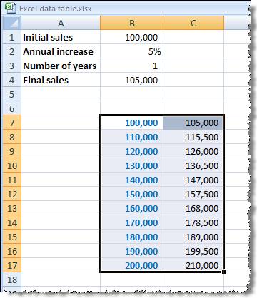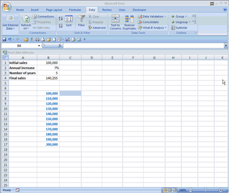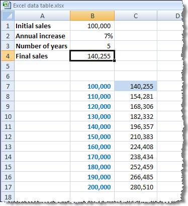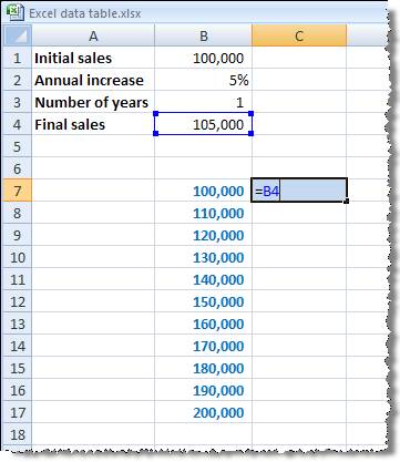 Our formula is: =B1*(1+B2)^B3 Now let's assume that we want to know what the final sales would be for different initial sales figures. We can type in a list of different starting values, and immediately to the right of the first value in our table we type a reference to our formula cell: B4: