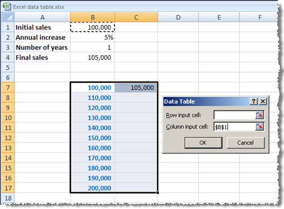 For a one-way data table where we have the list of values arranged vertically, we only need to enter the 'Column input cell' - this should be the cell that contains the value that is to be replaced in the formula with each one of the list of values. So, in our case, it is cell B1 that contains the 'Initial sales' value, and we have created a list of alternative values for B1. When we click the OK button, our table will be created: